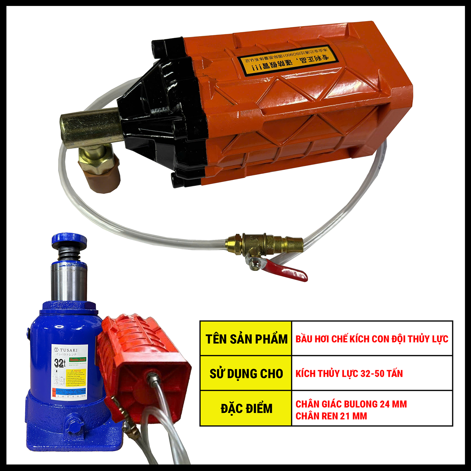Bầu hơi chế kích tay thủy lực TUSAKI là giải pháp tối ưu giúp bạn nâng cấp chiếc kích con đội thủy lực bằng tay truyền thống thành một chiếc kích thủy lực dùng hơi (khí nén) hiện đại. Đây là phụ kiện không thể thiếu trong các garage sửa chữa ô tô, xưởng cơ khí, đặc biệt là nơi thường xuyên phải nâng hạ các loại xe tải, xe khách có trọng tải lớn (từ 20 tấn đến 50 tấn).