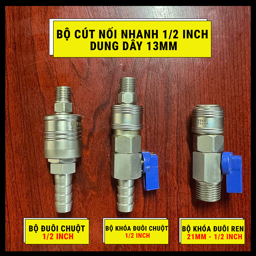 Bộ cút nối nhanh 1/2 inch cho dây 13mm là phụ kiện quan trọng trong hệ thống khí nén, giúp kết nối dây hơi và thiết bị một cách nhanh chóng, chắc chắn và không rò rỉ khí. Sản phẩm được gia công từ thép mạ chất lượng cao, có độ bền vượt trội, chịu áp lực lớn và hoạt động bền bỉ trong môi trường gara, nhà xưởng hoặc dây chuyền sản xuất. Thiết kế ngàm khóa thông minh cho phép thao tác tháo – lắp chỉ trong 1 giây, tiết kiệm thời gian và đảm bảo hiệu suất làm việc cao. Phù hợp dùng cho các loại máy nén khí, súng mở ốc, máy mài hơi, máy bắn ốc, và thiết bị khí nén công nghiệp.