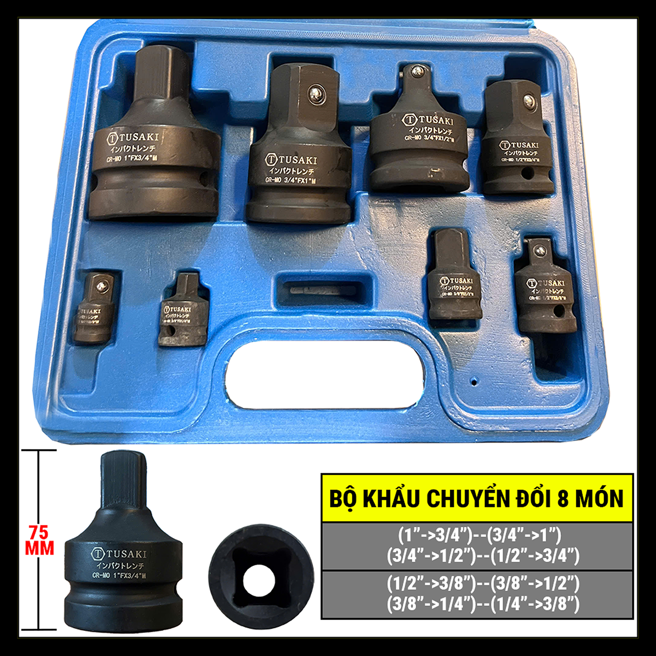 Đa năng và tiện lợi: Với 8 chi tiết, bộ sản phẩm cho phép chuyển đổi qua lại giữa tất cả các kích thước phổ biến (1/4 inch, 3/8 inch, 1/2 inch và 3/4 inch). Ví dụ, bạn có thể dễ dàng dùng khẩu 1/2 inch với tay vặn 3/8 inch.