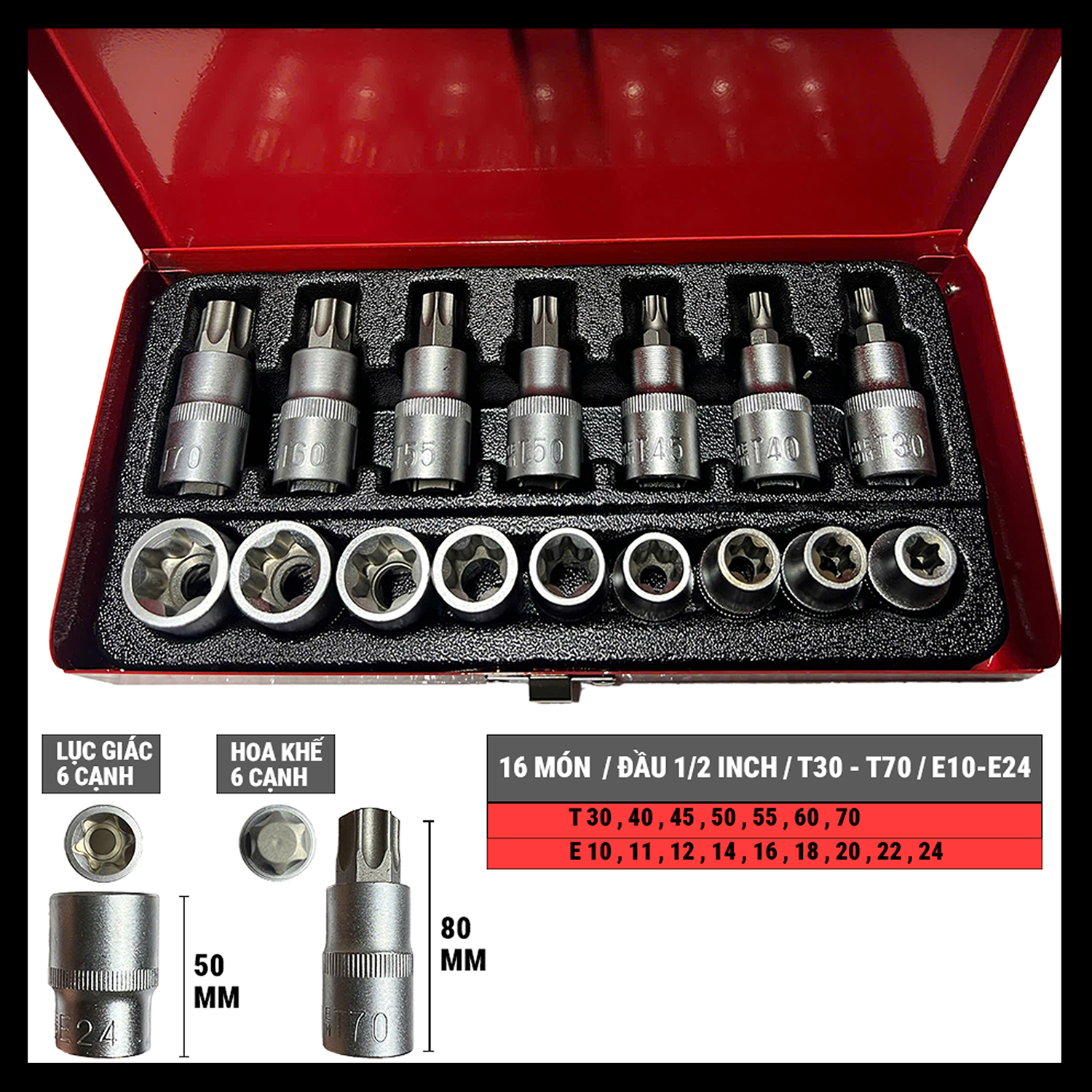 Bộ tuýp 16 món 1/2 inch lục giác là bộ dụng cụ cơ khí chất lượng cao, bao gồm các cỡ tuýp thông dụng, giúp mở ốc và bu lông nhanh chóng, chính xác. Thiết kế chắc chắn, bền bỉ, phù hợp cho thợ cơ khí, sửa chữa ô tô và bảo dưỡng máy móc công nghiệp. Bộ tuýp 10 món lục giác này là giải pháp tiện lợi, giúp tiết kiệm thời gian và nâng cao hiệu quả công việc.