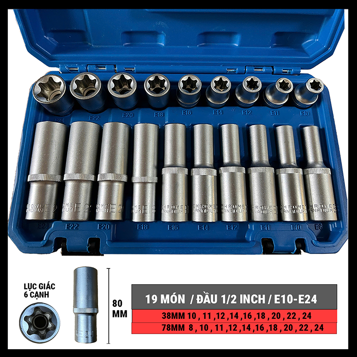 Tóm tắt thông số: Khẩu 1/2 inch, tổng cộng 19 chi tiết (bao gồm các size E phổ biến nhất).