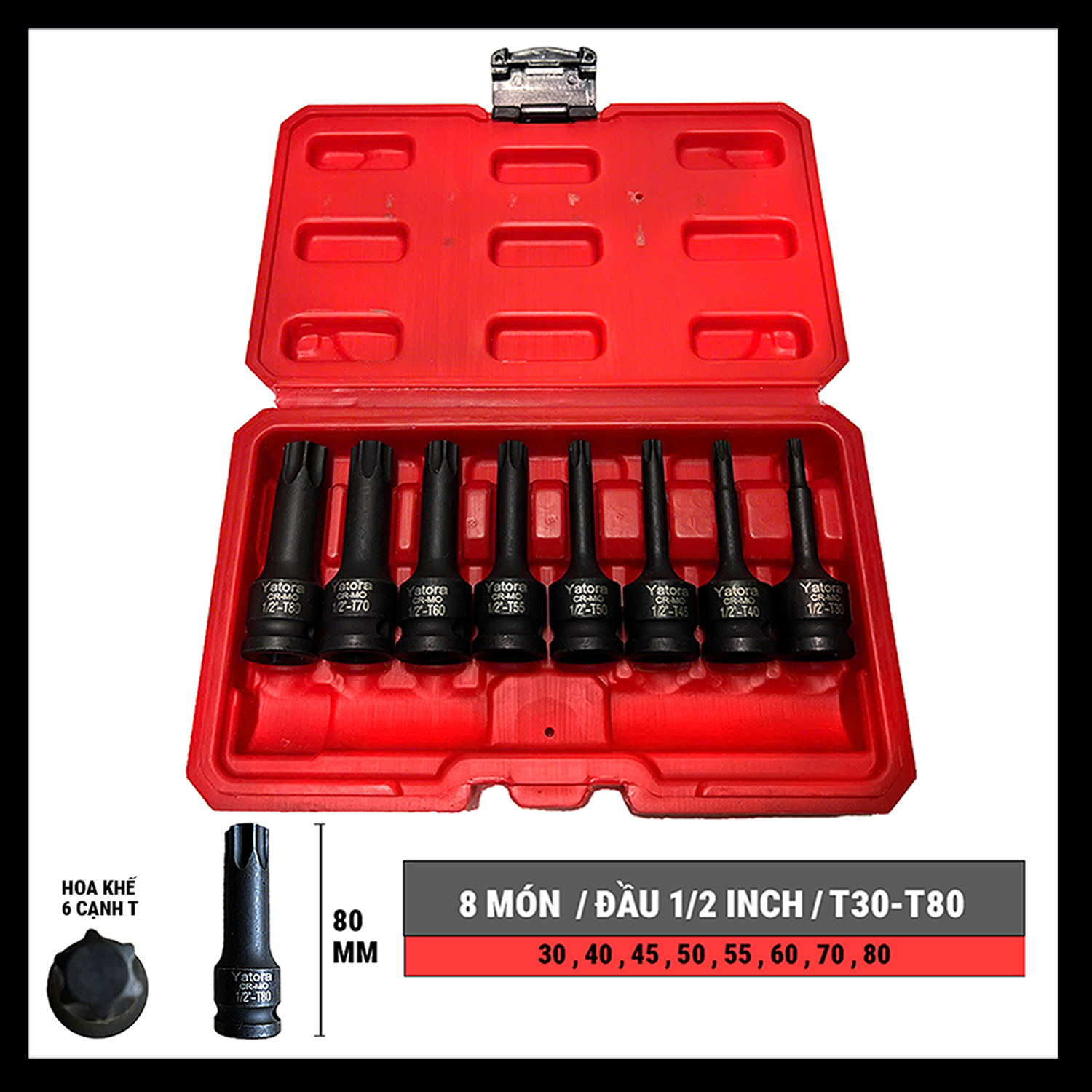 Bộ khẩu hoa khế 1/2 inch – 8 chi tiết được thiết kế chuyên dụng để tháo bu-lông dạng External Torx (E-type) – loại bu-lông phổ biến trong các dòng xe châu Âu, xe tải nhẹ, động cơ, hệ thống treo và nhiều chi tiết cơ khí chính xác.
