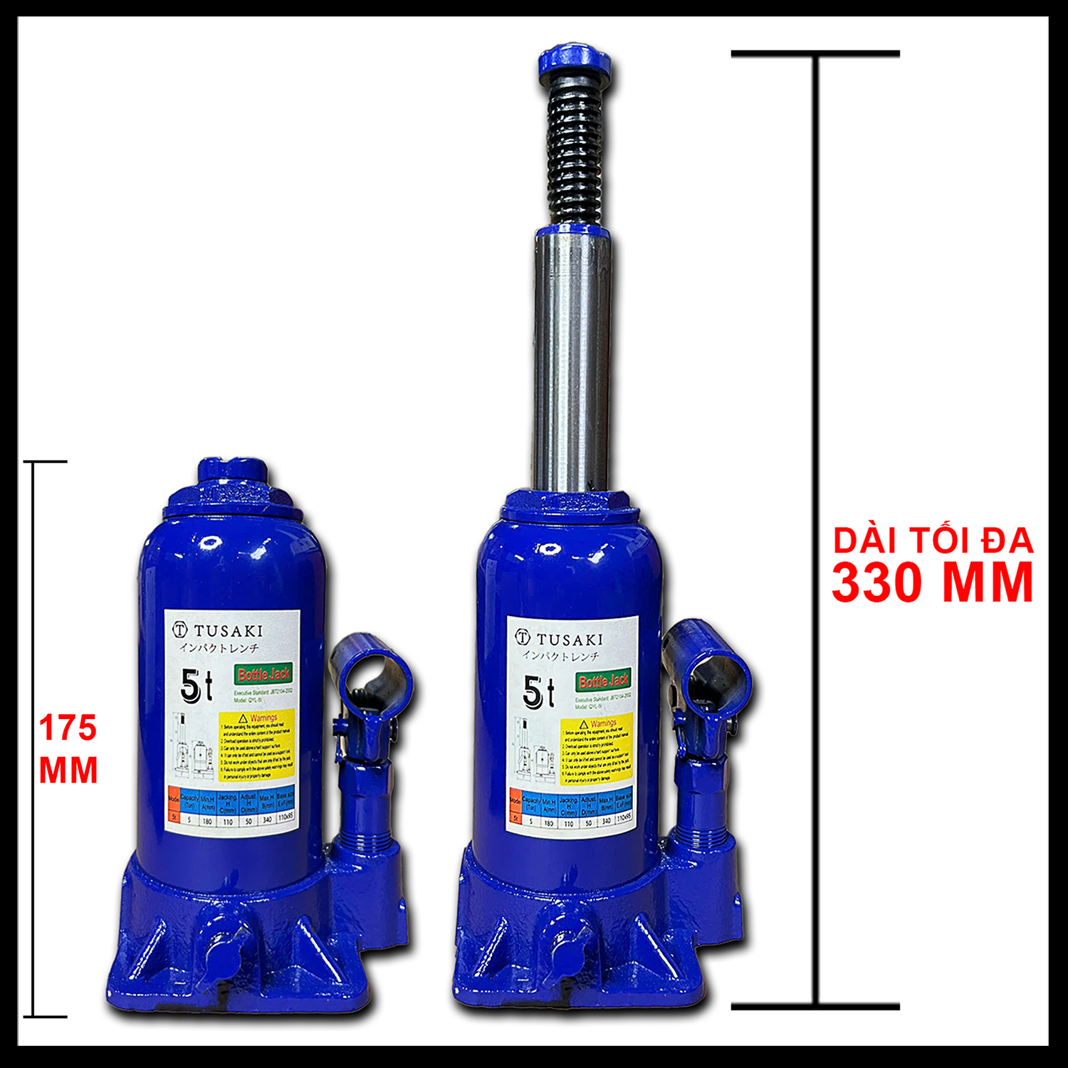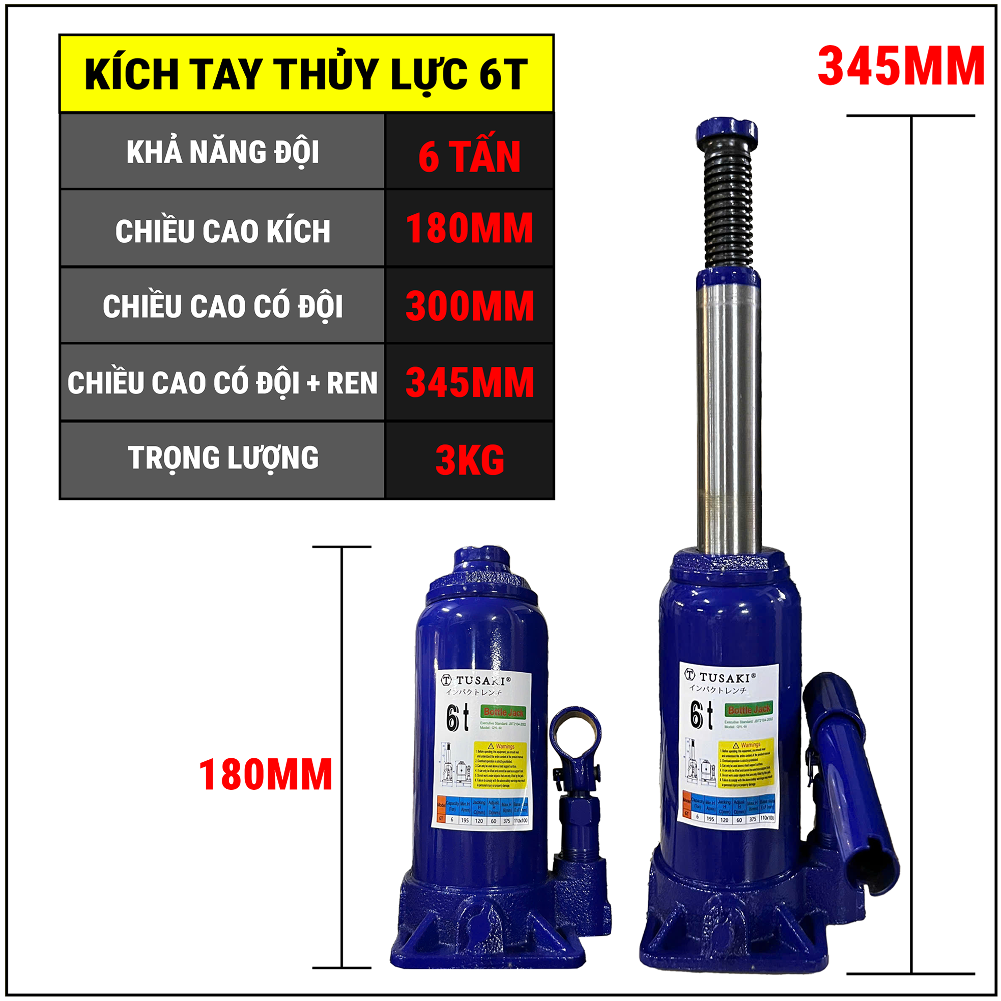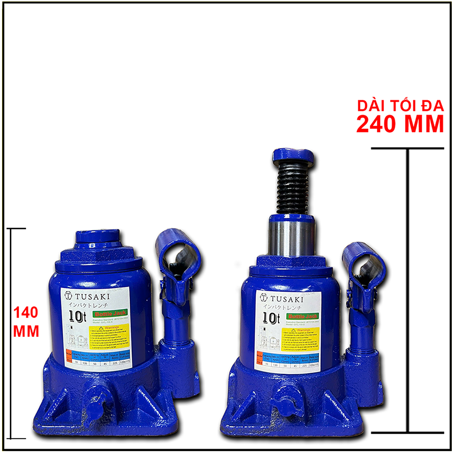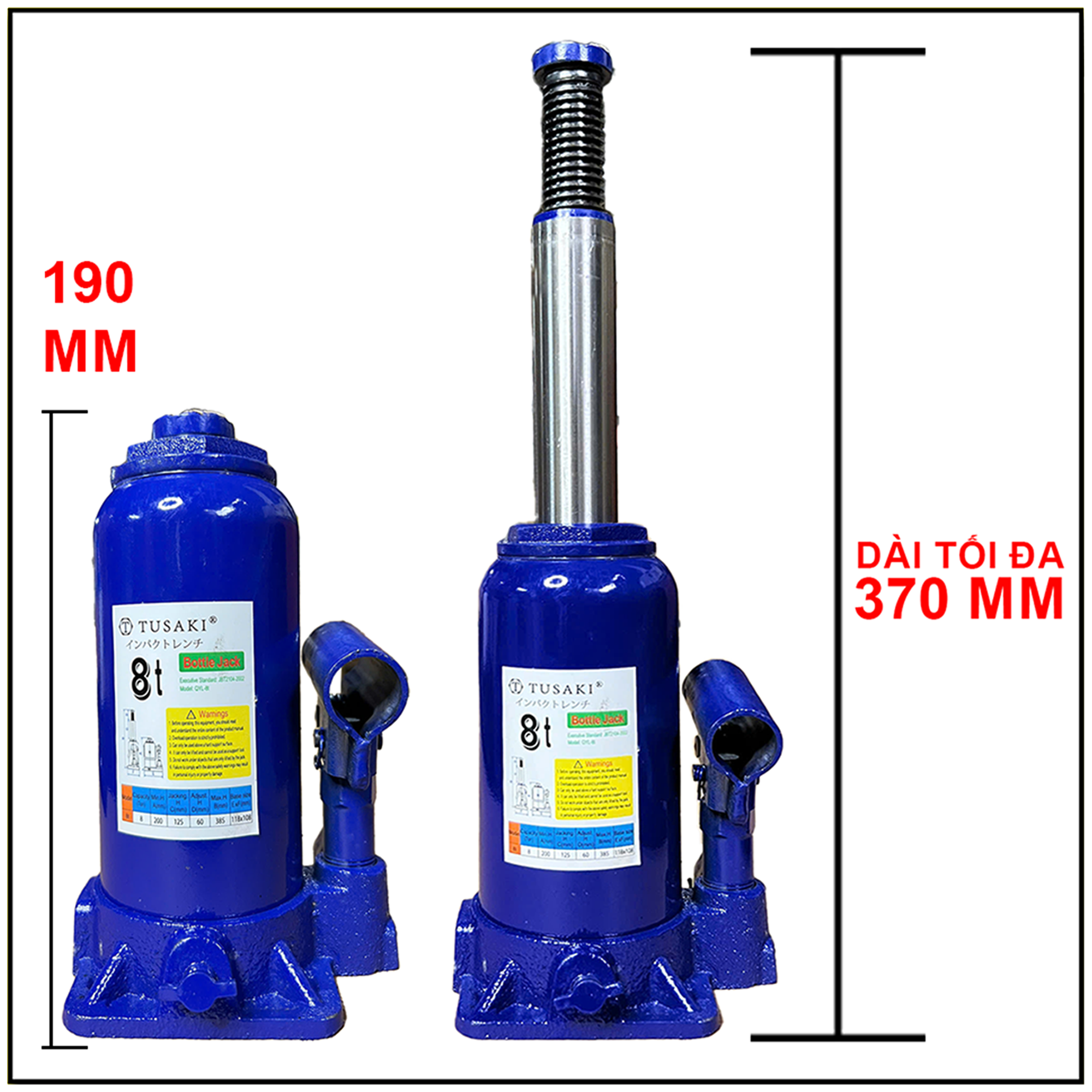 Kích tay thủy lực TUSAKI tải trọng 5 tấn, 6 tấn, 8 tấn và 10 tấn là dòng kích đội dạng chai được thiết kế chuyên dụng cho nâng ô tô, xe tải nhẹ, máy công trình và nhiều ứng dụng cơ khí khác. Với cấu tạo xi-lanh thủy lực ép kín, piston thép cứng và thân vỏ chịu lực cao cấp, kích mang lại hiệu suất nâng mạnh mẽ, an toàn và độ ổn định cao trong quá trình sử dụng.